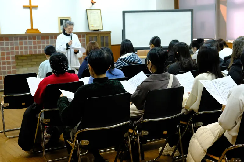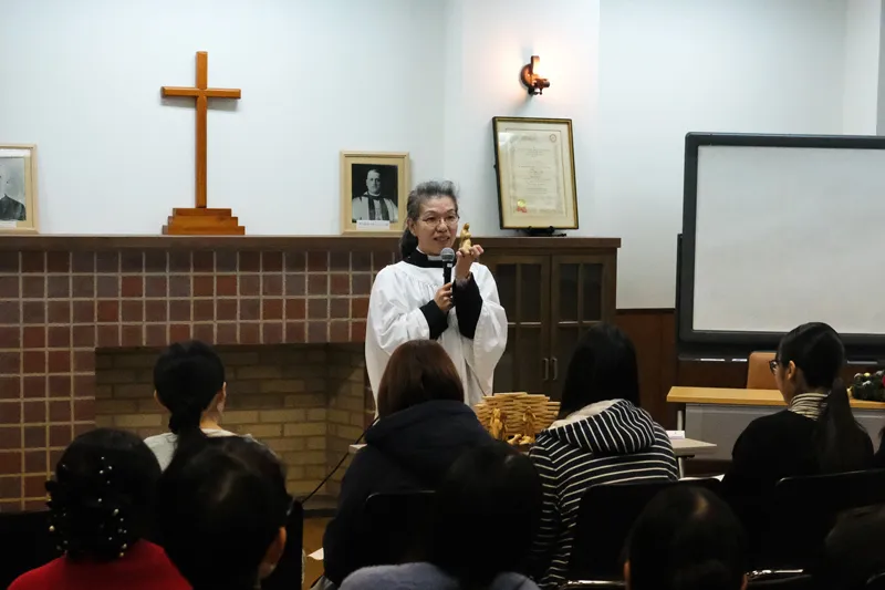 礼拝は中尾チャプレン司式のもと行われ、チャプレンからクリスマスについてのお話を聞き、オルガンの演奏で聖歌を歌いました。