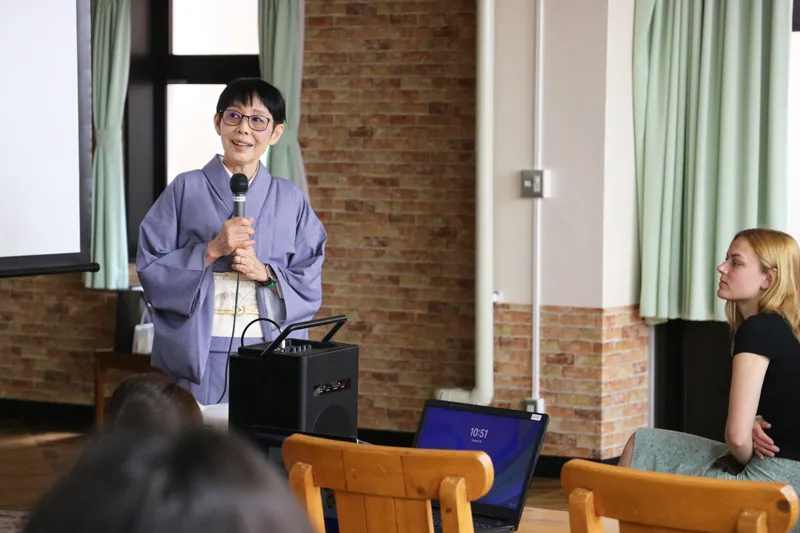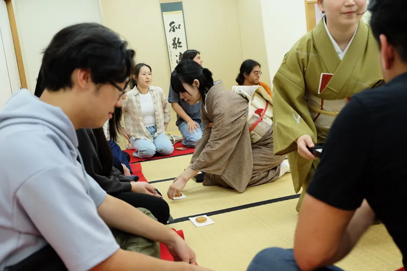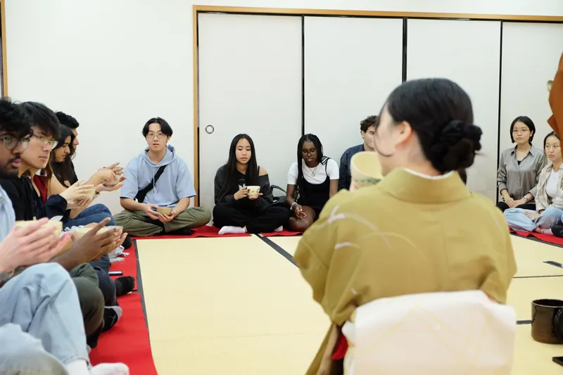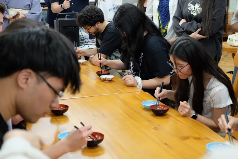 最後には、茶道部の学生によるお茶会を体験していただきました。グループに分かれて茶道を楽しんでいただき、順番を待つ間は、お箸での豆運びゲームを行ったり卓球をしたり、折り紙などの日本文化を紹介しながら鶴などを折るなどして、日本文化に親しんでいただきました。