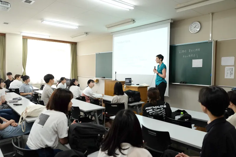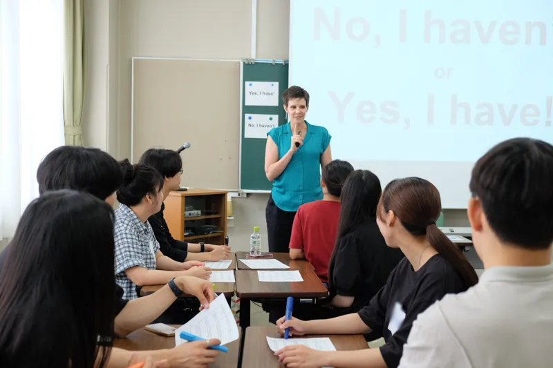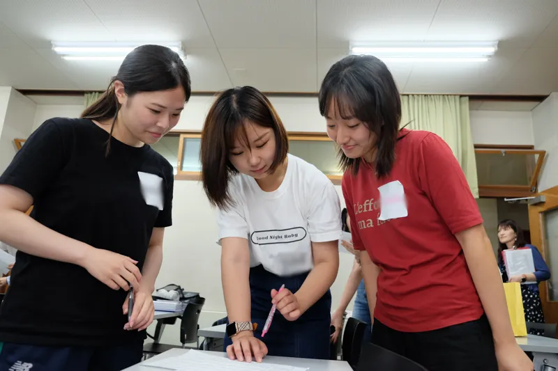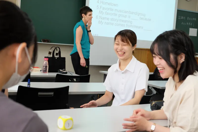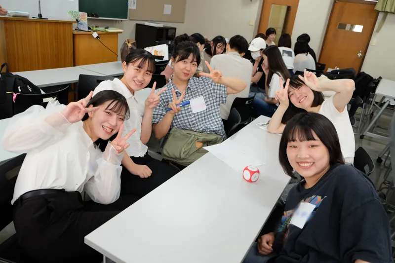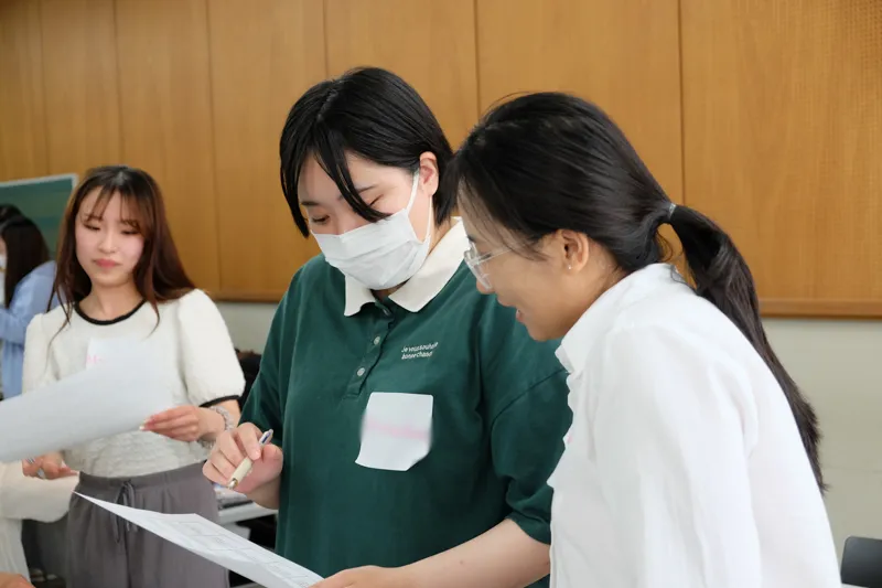 そのため、本学の学生とも英語で交流を行いました。ゲームなどを交えながら英語を楽しく学ぶ授業では、英語が苦手な学生にハンドン・グローバル大学の学生が英語を教えたり、覚えた英語で楽しそうに自分自身について語り合う姿が随所で見られました。