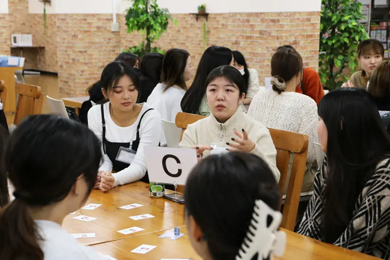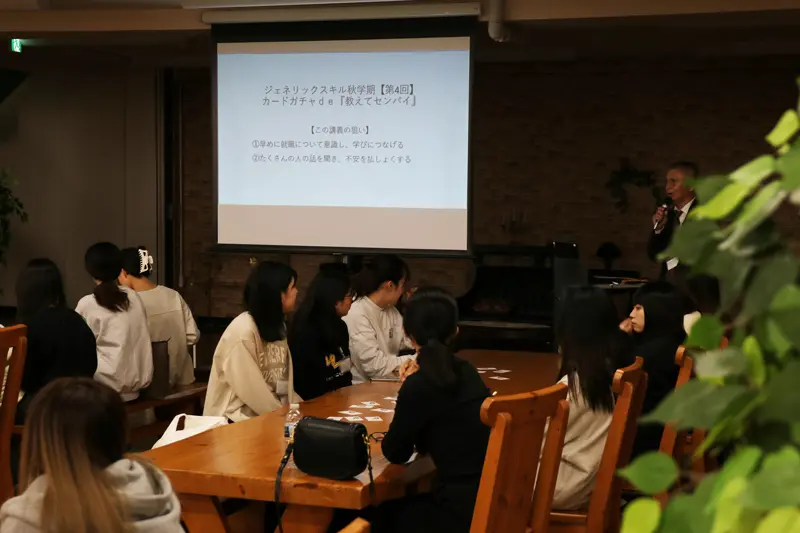 11月7日(火)に国際観光学部の2年生を対象にした、キャリアデザイン講座「内定者座談会『カードガチャde教えてセンパイ』」を実施しました。就職活動を終えた4年生11名に協力いただき、グループ毎に4年生を囲んで内定に至るまでの取り組みについての質問を行いました。自分の将来を考えたり、具体的な就職活動は「まだ先のこと」と思いがちな2年生には、4年生の等身大の経験談に触れる機会となりました。