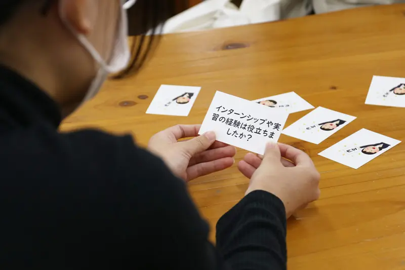 などの就職活動に関する質問が書かれたカードが用意され、2年生が順番にめくって4年生に読み上げるカードゲーム形式での進行となりました。
