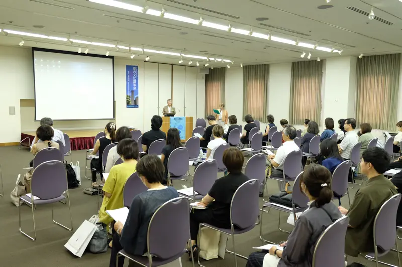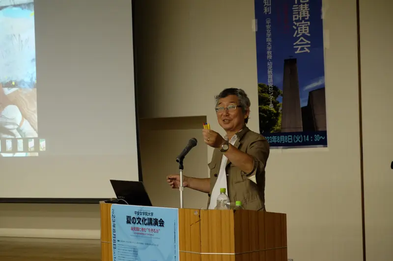 8月8日(火)に高槻城公園芸術文化劇場北館にて、子ども教育学部 教授の塩見知利先生による夏の文化講演会「幼児期に育む”生きる力” -乳・幼児の造形が教えてくれる10のこと-」を開催、約60人に御参加いただきました。