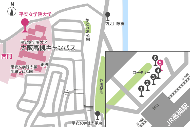 JR高槻駅より市バス5番のりばから、「70平安女学院大学経由 関西大学」にて約17分、「平安女学院大学」下車。