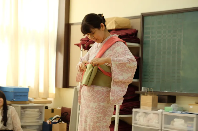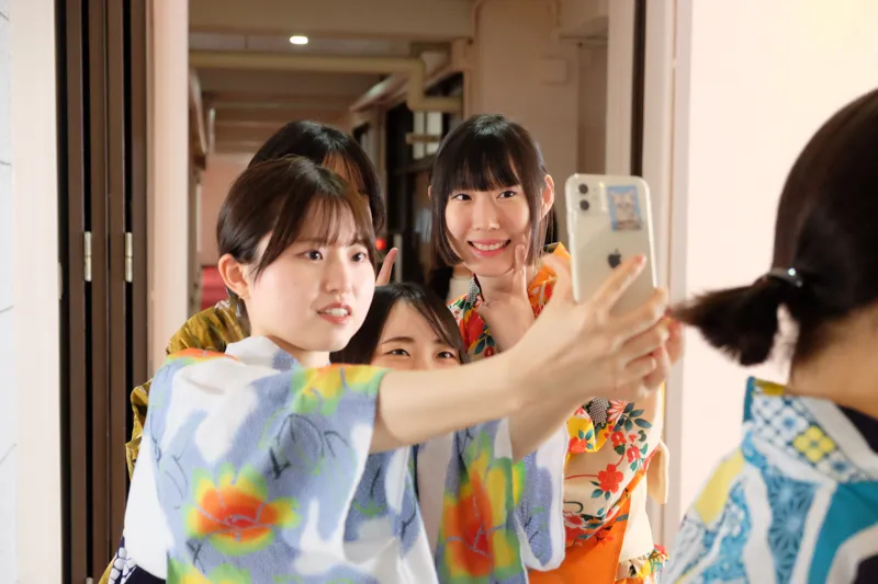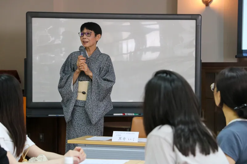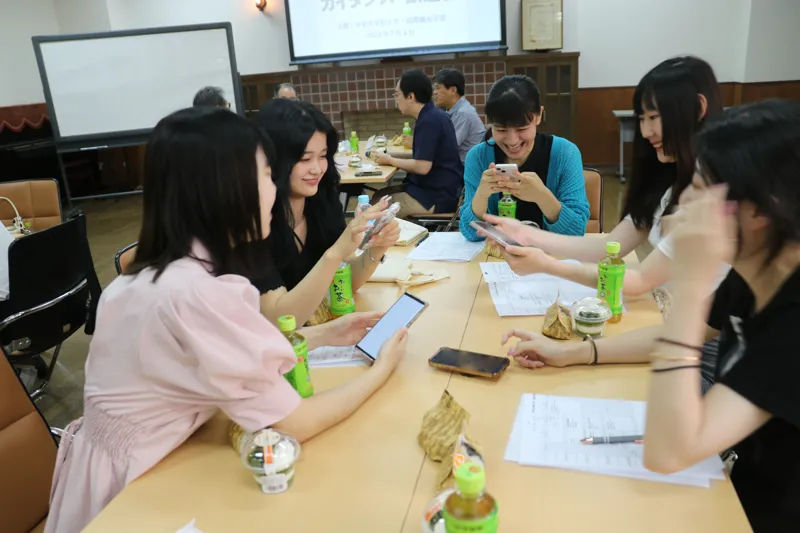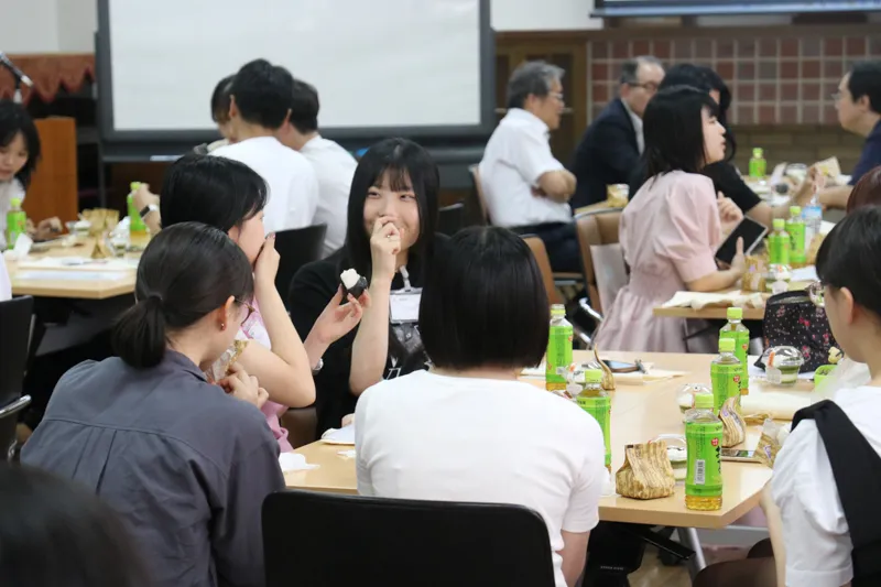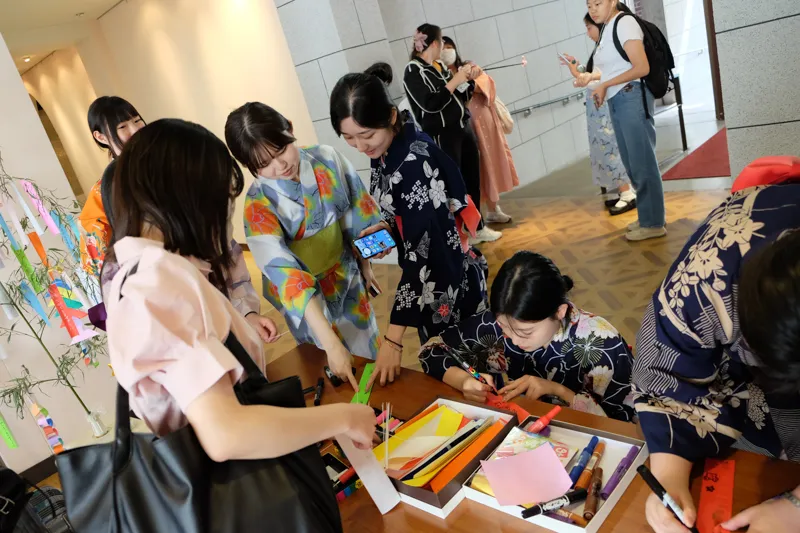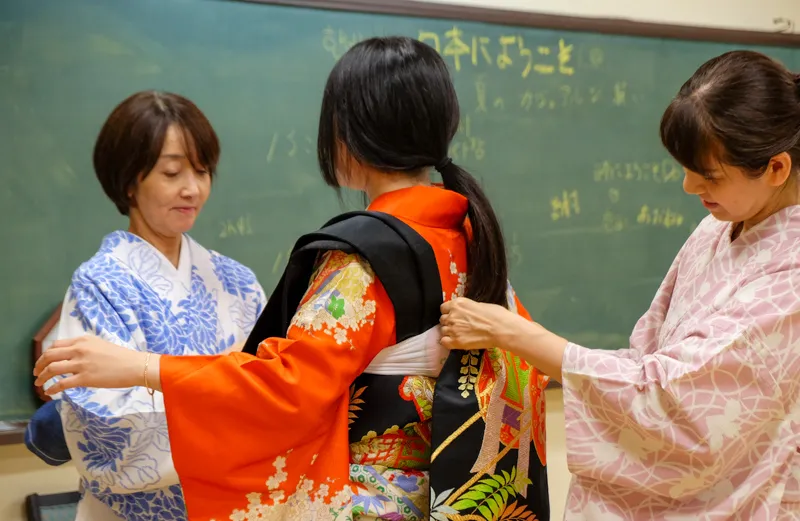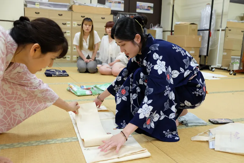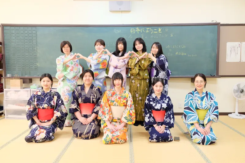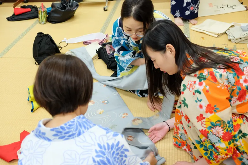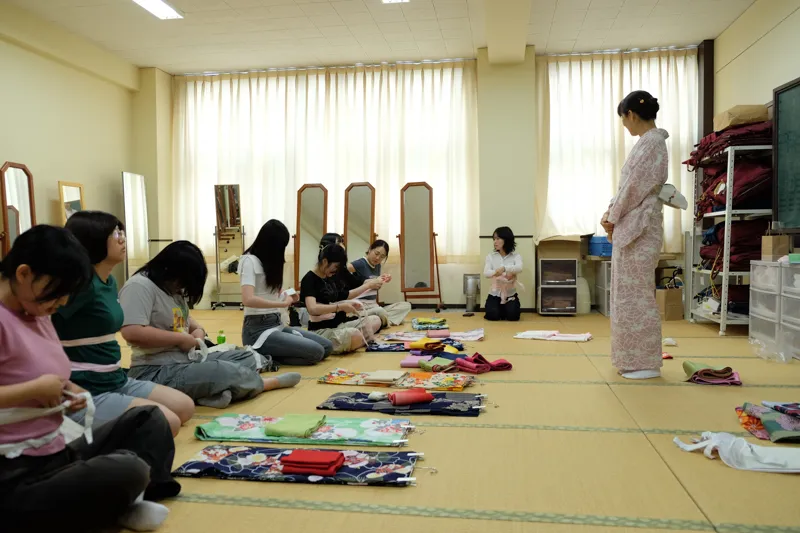 研修初日には、本学の学生と食事会で交流したり、浴衣や着物の着付けについて学んでいただきました。