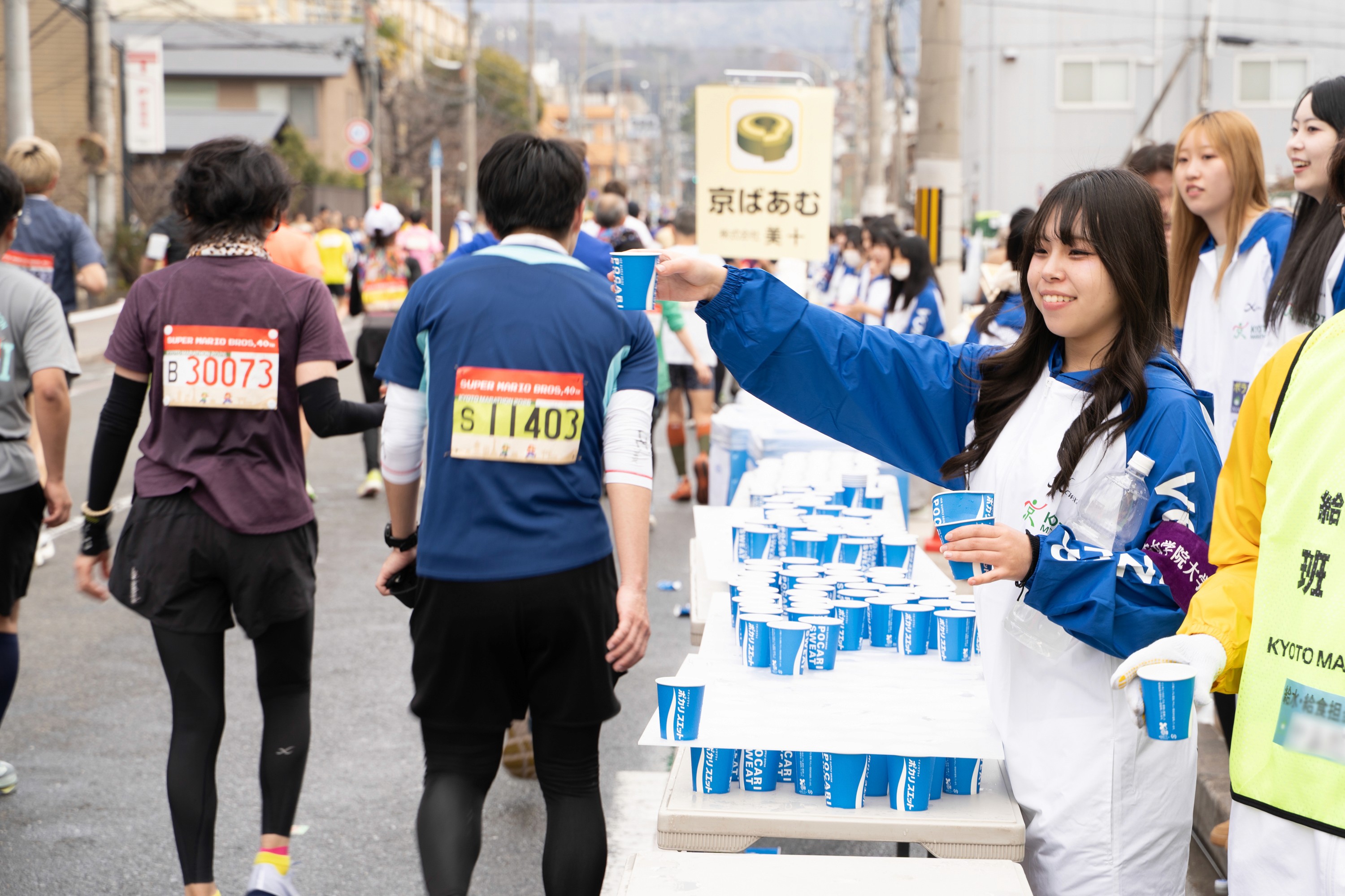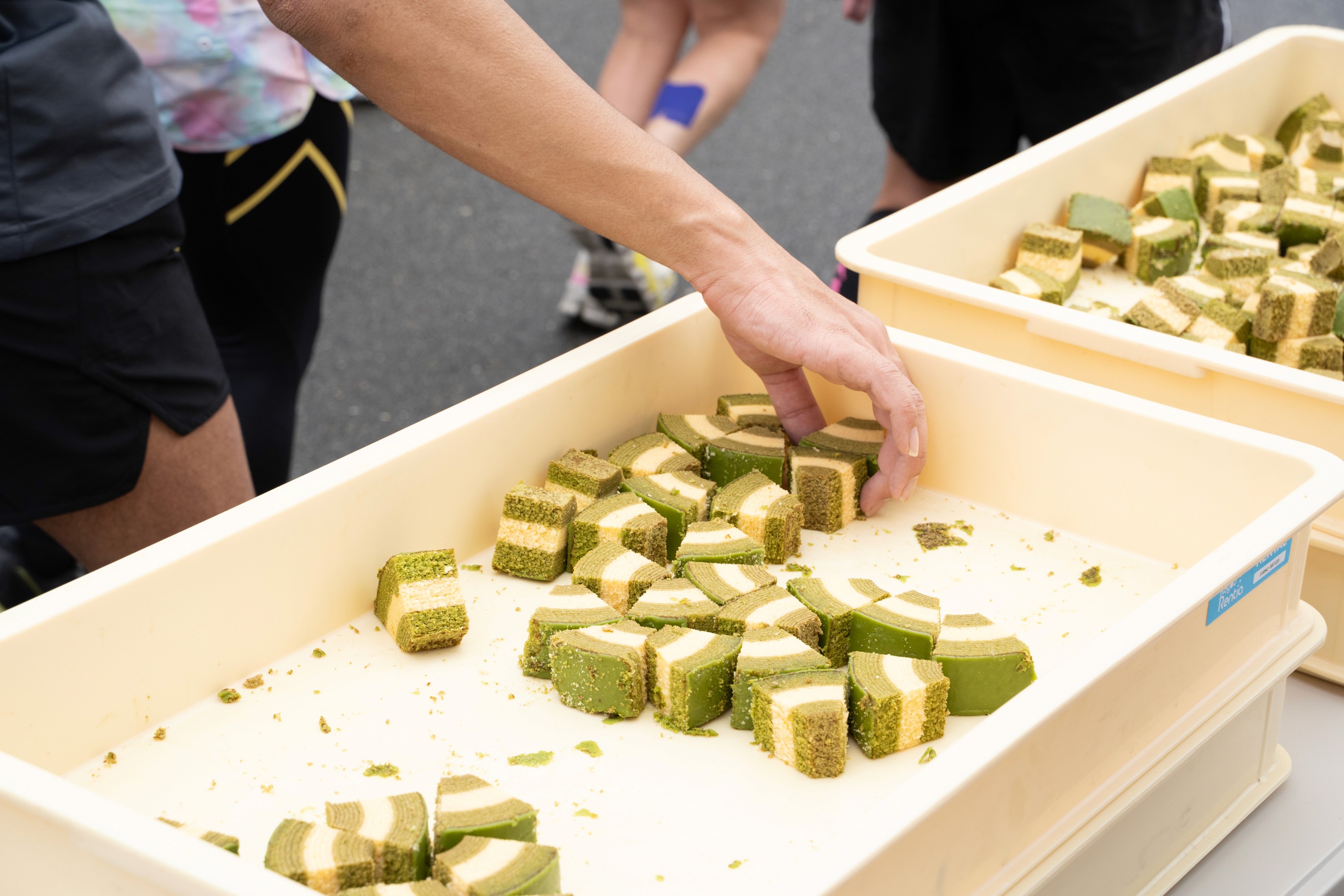 昨年度から引き続き、ランナーの皆さんへの給水サポートと「京ばあむ」の給食を担当しました。ランナーの皆さんが走りながらでも食べやすいよう、一つひとつ丁寧にカットし、笑顔とともに提供することを心がけました。