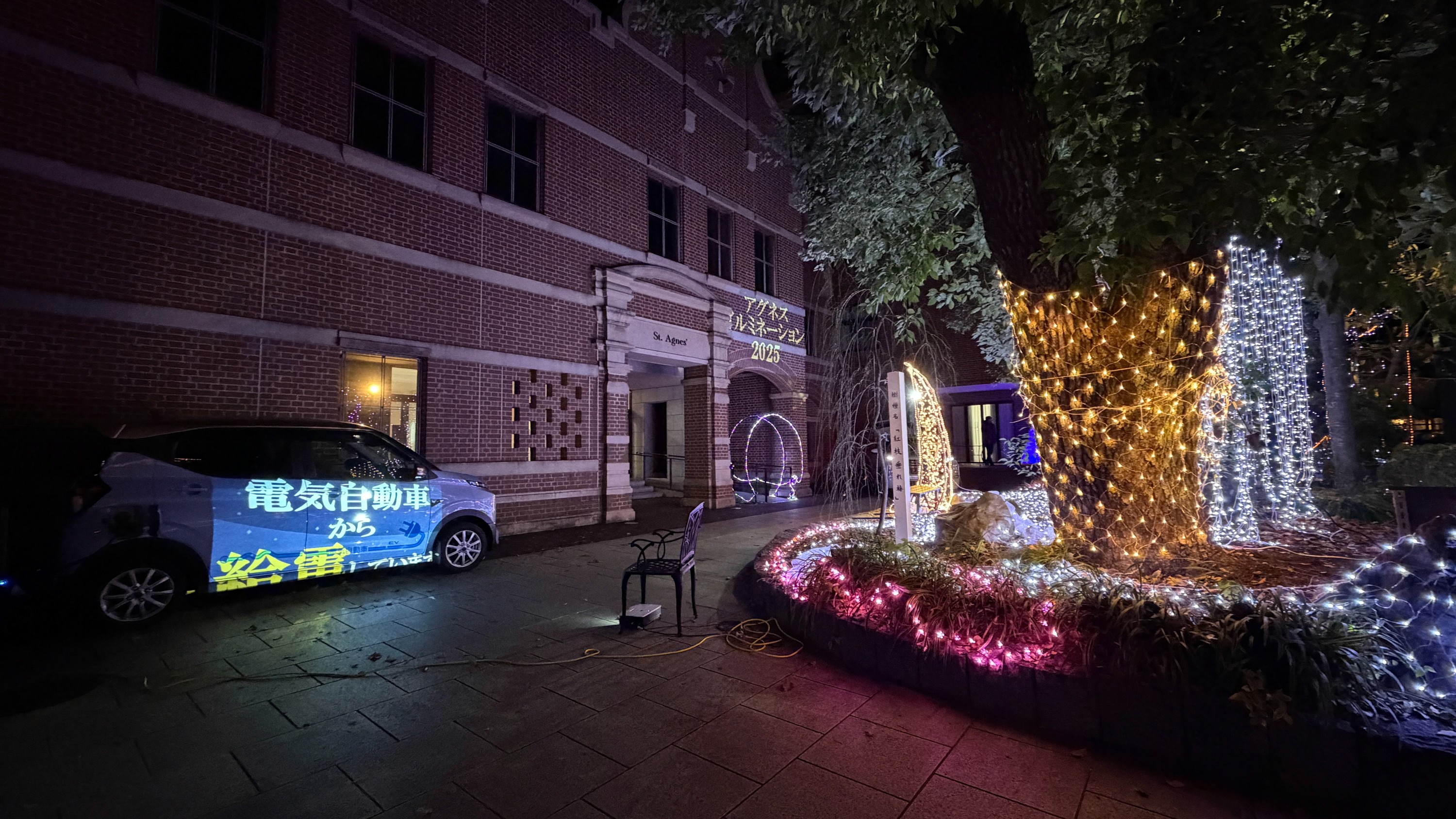 12月12日(金)と12月13日(土)に京都キャンパスにて、電気自動車の再エネで給電する、環境にやさしい再エネ100%イルミネーションを開催。