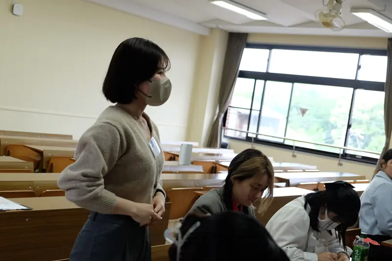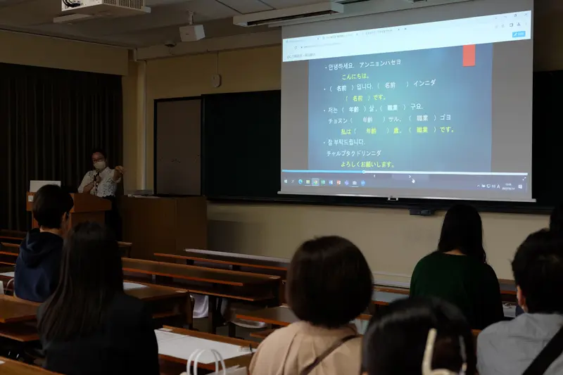 韓国ドラマを通して、韓国語の挨拶や自己紹介についても学びました。韓国では上下関係がしっかりとしていることや韓国語にも敬語の表現があることを説明。また、ドラマの撮影地をめぐる旅行ツアーができているなど、大衆文化と観光にはつながりがあることを解説しました。