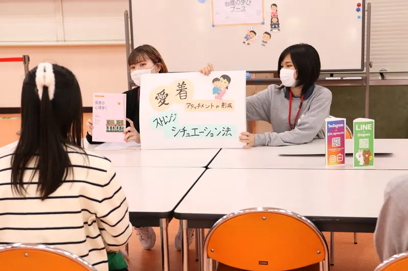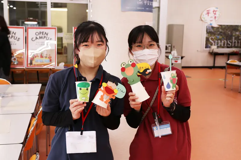 学生が運営する3つのブースで、子ども教育学部の特徴的な学びを体験しました。「保育・教育」ブースでは保育実習の様子やそこでの取り組みについて、「心の学び」ブースでは子どもと保育者との間の愛着形成について学生が説明し、「造形」ブースでは紙コップとストローで歌うカエルを学生と一緒に作りました。