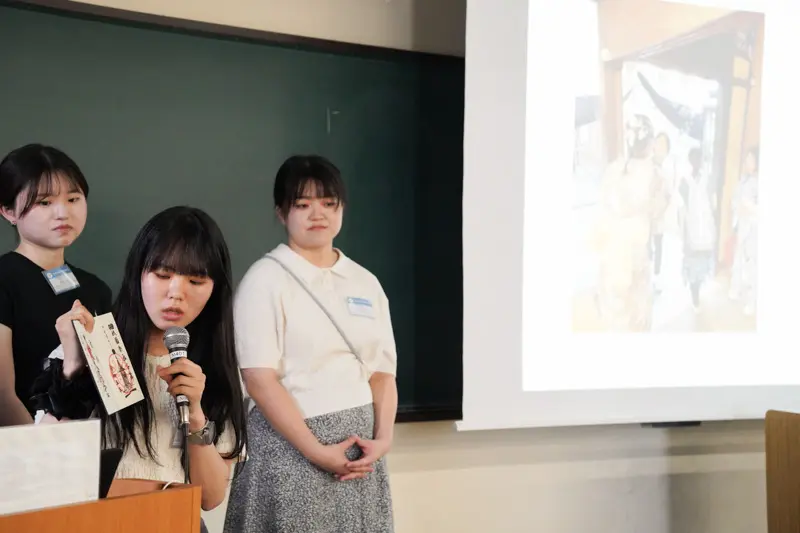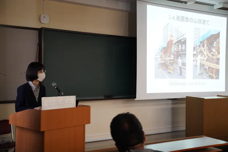 今ちょうど行われている祇園祭について、概要や日程、前祭・後祭の山鉾建ての位置・巡行路の違いなどを紹介。大船鉾のちまき授与ボランティアに参加した学生の話などを交えての解説は、祇園祭をより身近に感じることができたのではないでしょうか。