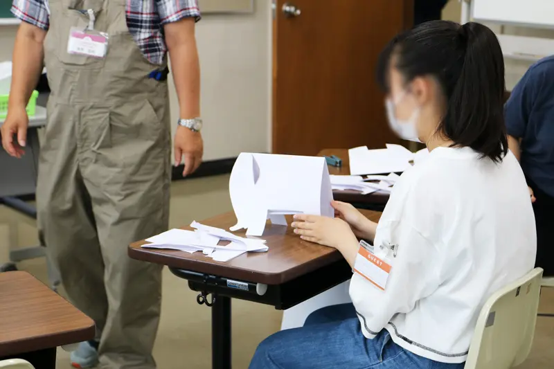 1枚の画用紙とはさみを使って鳩と象のペーパークラフトを作成しました。子どもに飽きさせず作り方を教えるための工夫や、完成したペーパークラフトを使って子どもの自由な発想を引き出す方法など、ただ作って楽しむだけではない保育技術としてのペーパークラフトを学びました。